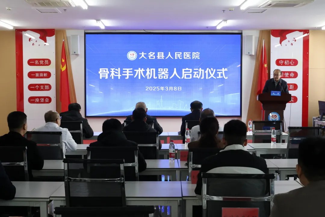 3月8日上午,大名县人民医院隆重召开“骨科手术机器人启动仪式”,院党委书记程东强、县卫健局副局长董占军出席会议并致辞,副院长兼骨一科主任张凤海、党委副书记兼骨二科主任张汉浩及相关科室人员,20家乡镇卫生院的院长参加会议,院长成涛主持会议。