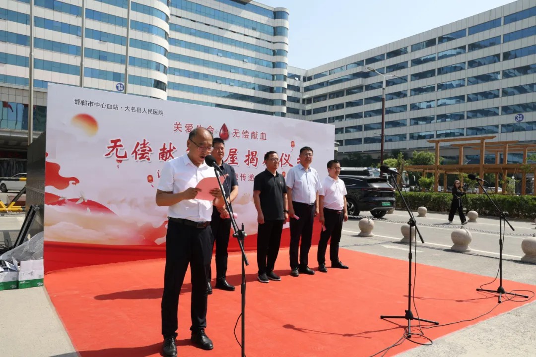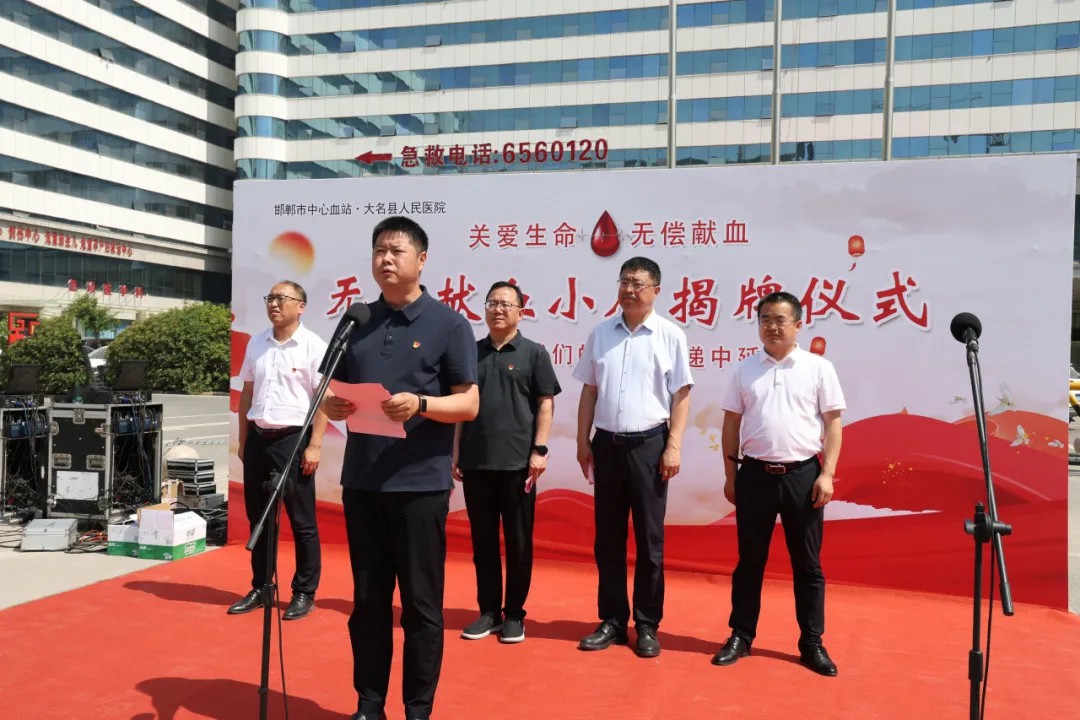 仪式由大名县人民医院院长成涛主持。向莅临仪式的各位领导和嘉宾表示热烈的欢迎!他表示,无偿献血是用爱心为生命续航的崇高事业,是社会文明进步的重要标志。今天的揭牌仪式,标志着我县无偿献血工作进入了“规范化、便民化、常态化”的新阶段。