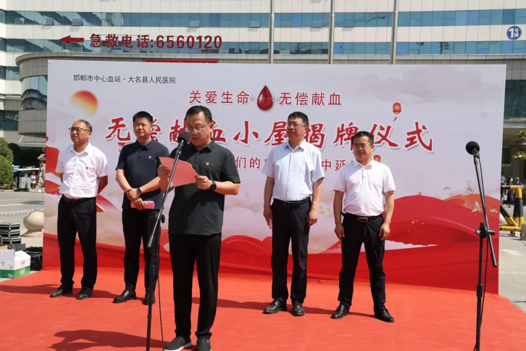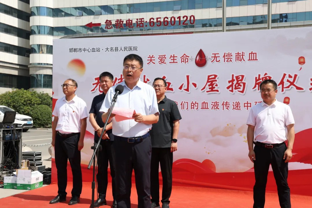 邯郸市中心血站书记杨小岗致辞,他对大名县人民医院在无偿献血工作中的大力支持表示感谢,并强调了血液保障工作对于医疗救治的重要性。血站将与医院紧密合作,加强对献血小屋的管理和服务,确保血液采集工作安全、有序进行。